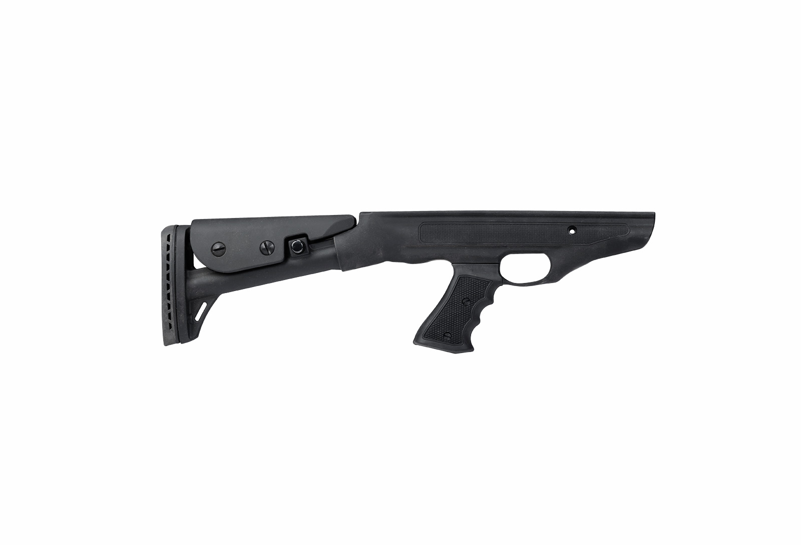 Svartfärgad teleskopkolv med justerbar längd och höjd på kindstöd. Passar Supercharger och Supertact.